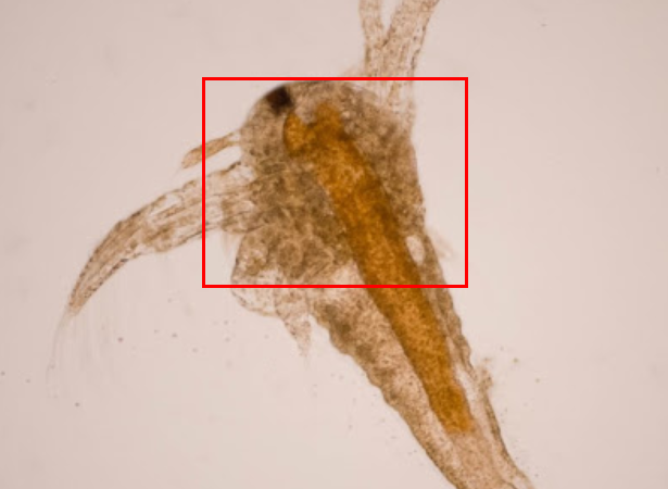 The picture below is a brine shrimp larvae, and you can see that the central part is the yolk and the orange color from the waist to the tail appears to eat the yolk and go down to the digestive system. Below, it is presumed to be a little past after hatching. (Naupliar stages)